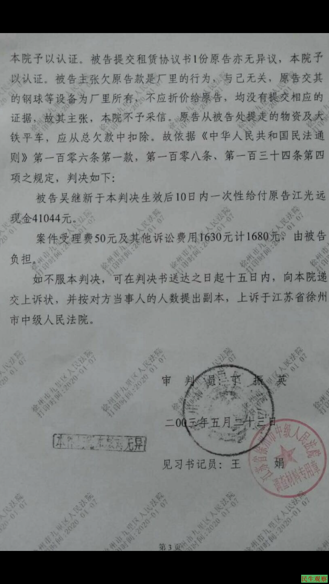就在吴继新期待退休养老金工资的同时,让他担心的一件事使他非常担忧,吴继新另外一个信访案件的问题,在2003年4月21日九里法院开庭审理江光远和吴继新的案件过程中,当时吴继新给法院提出起诉主体不对,因为吴继新是租赁徐州华泰混凝土外加剂厂的小型水泥车间期满,按法律法规定应该起诉徐州华泰混凝土外加剂厂,应该把吴继新作为第二破告。当时吴继新向丁振英法官提到这个法律问题他应该是第二被告不是第一被告,丁振英法官对江光远说:吴继新懂法。丁振英法官又对吴继新说:我们判决完后在到厂里去拆设备,吴继新在这样被欺骗的情况下同意开庭审理了。
