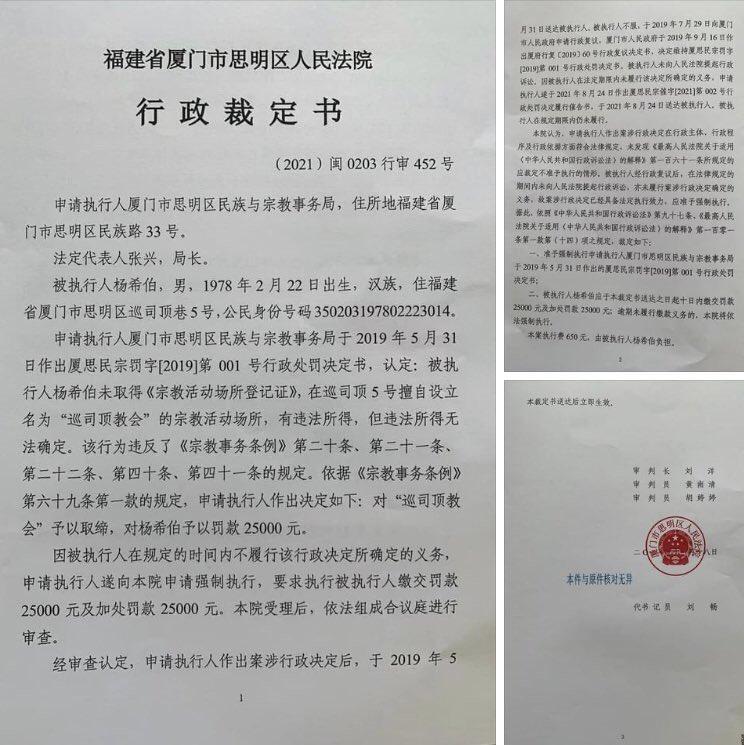 2021年7月29日,杨希伯传道和他的妻子王晓飞收到厦门市思明区民族与宗教事务局的行政处罚告知书,因组织聚会他们被处以20万元的罚款。随后,杨希伯传道委托律师向法院提起行政诉讼。