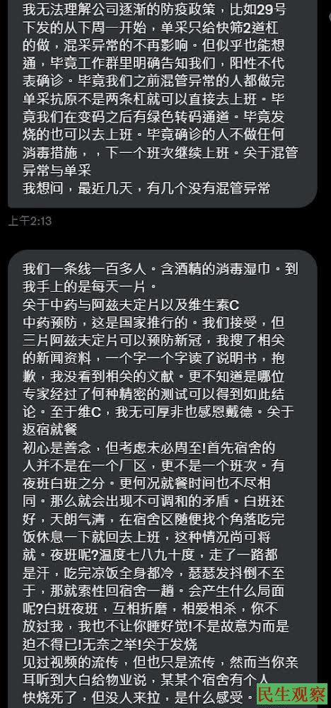 员工说,厂里的商店因为疫情都不让开了,能正常上班的人还能吃到工作餐,一旦被隔离起来的话就只能等人送饭。有工人说在宿舍等了两天,收到的盒饭都是变质的。