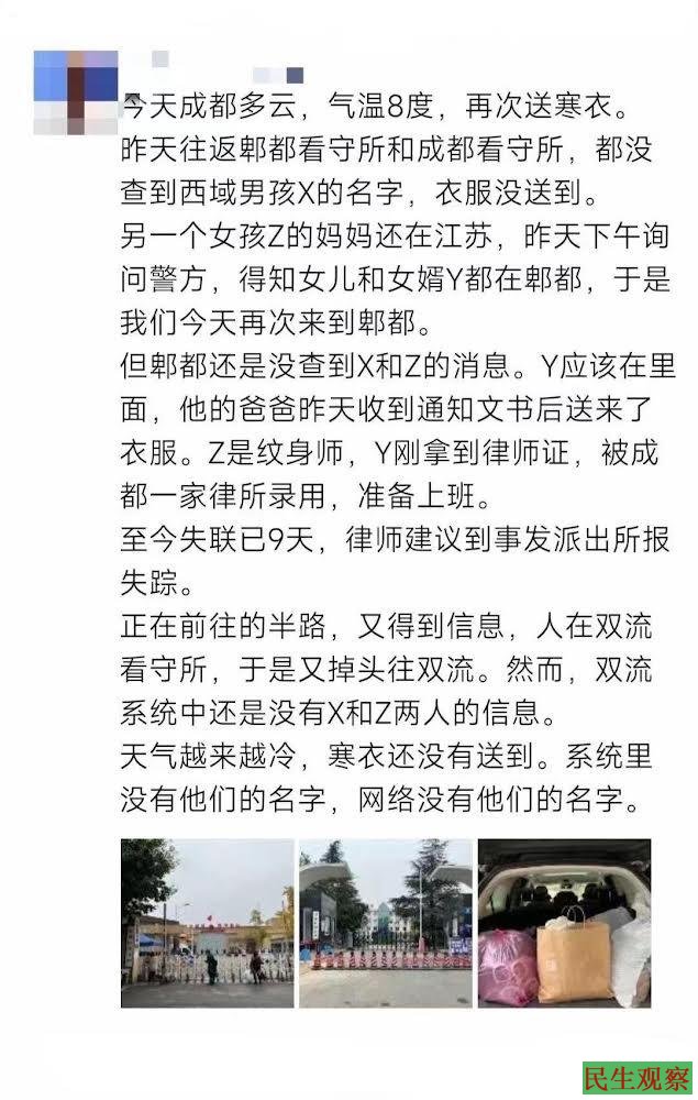 【民生观察2022年12月8日消息】近日,有成都网友披露了成都“白纸革命”中年轻人被抓捕的情况,以及前往看守所送寒衣,但系统里查不到被抓捕者名字的经过。恳请大家多多关注!