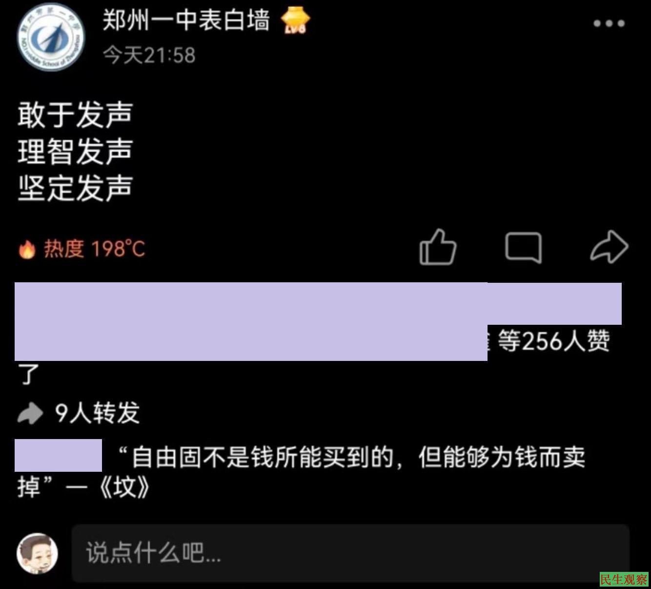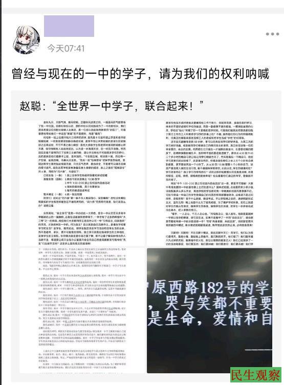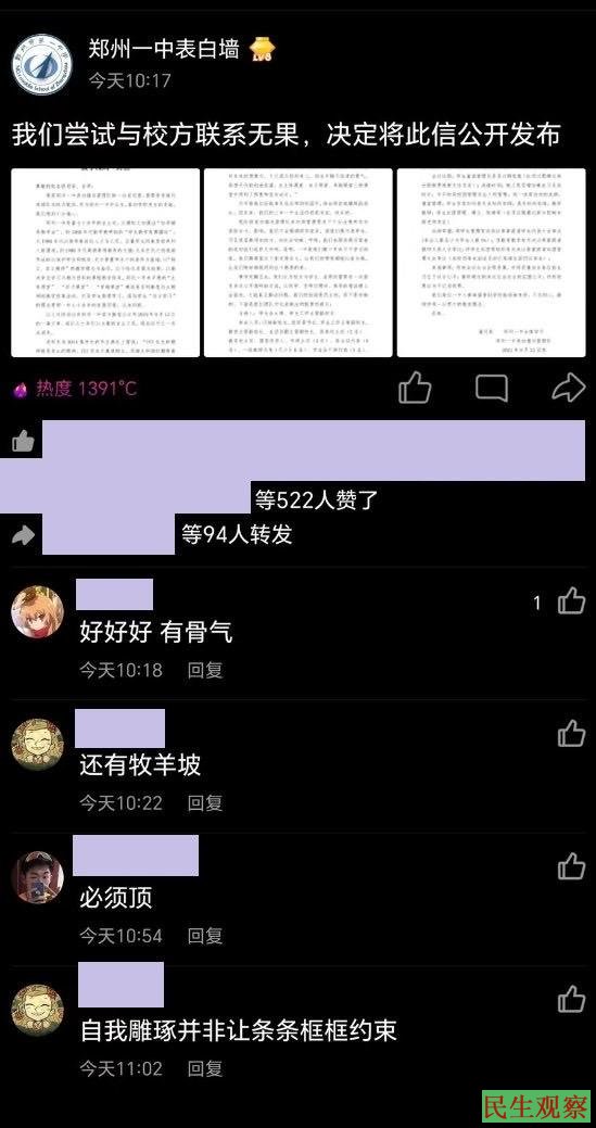 【民生观察2023年9月25日消息】2023年9月23日,郑州一中的同学因不满新校长突然宣布禁止穿短裤短裙,强制跑操,苛扣休息时间等一系列不合理规定,因而组织反抗,在线下线上张贴《告全体一中学生书》和针对校长的《讨闫檄文》。该行动亦获得往届毕业的学长们的声援。9月24日,郑州一中表白墙公开发布一篇《致学校的一封信》,希望校方就上述不合理规定与民选师生代表进行对话。