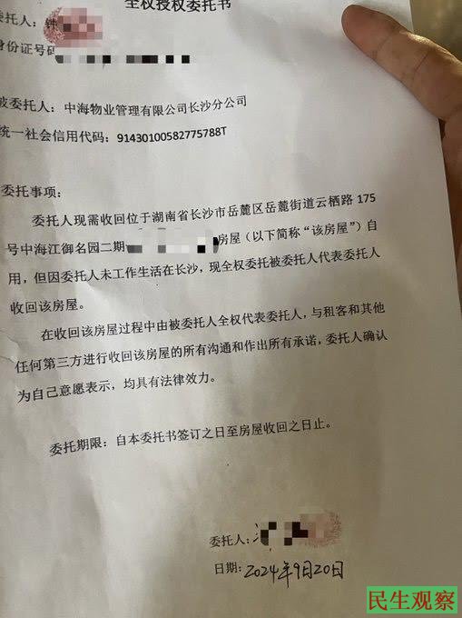另据一段视频显示,2024年9月22日10:41分,两名中海物业管理有限公司的男性工作人员,敲开陈燕慧位于长沙市岳麓区岳麓街道云栖路175号中海江御名园二期的租住房屋。物业称,房东因为要自用,已经全权委托物业收回该房屋,希望她能在10天之内搬离该房屋。