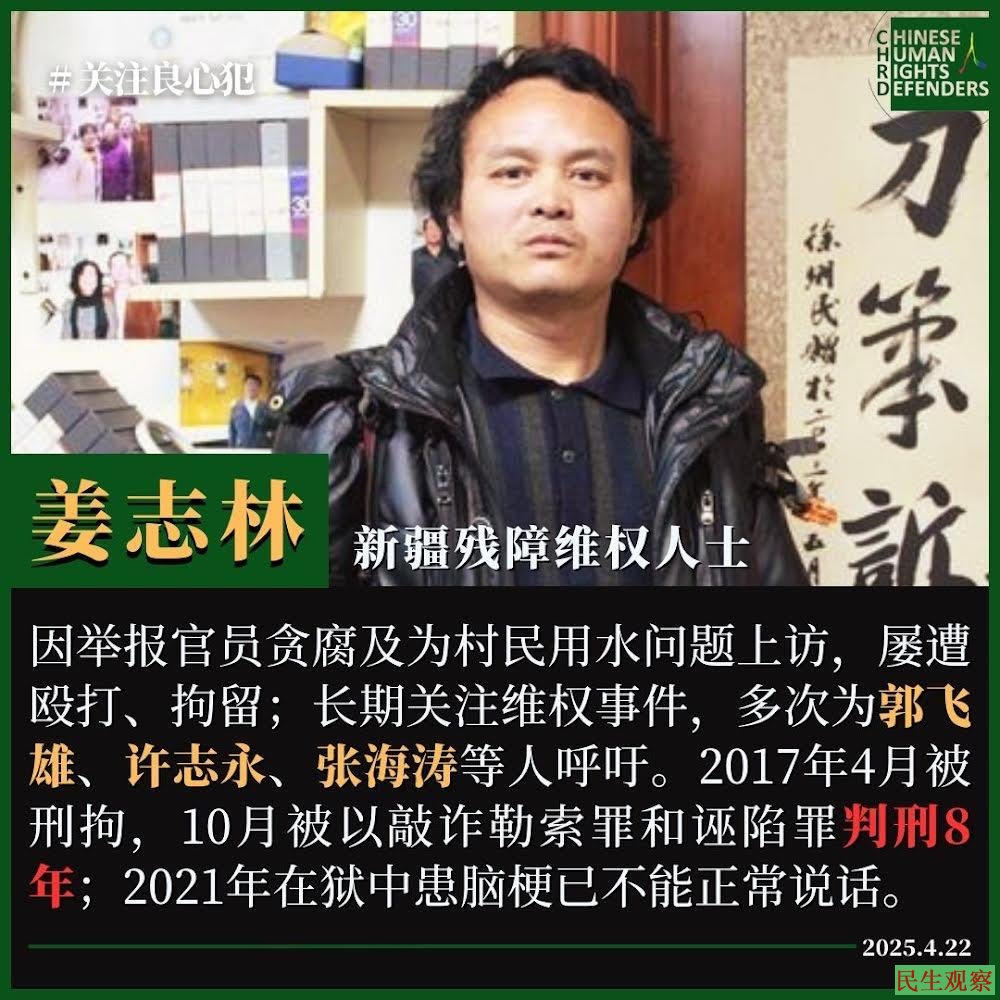 因此得罪了更多更广范围的既得利益者,被新疆警方一再追打报复、拦截关押或限制人身自由。直到2017年4月,当局用莫须有的罪名罪证,在同年十月将姜志林秘密审判,判处八年有期徒刑。