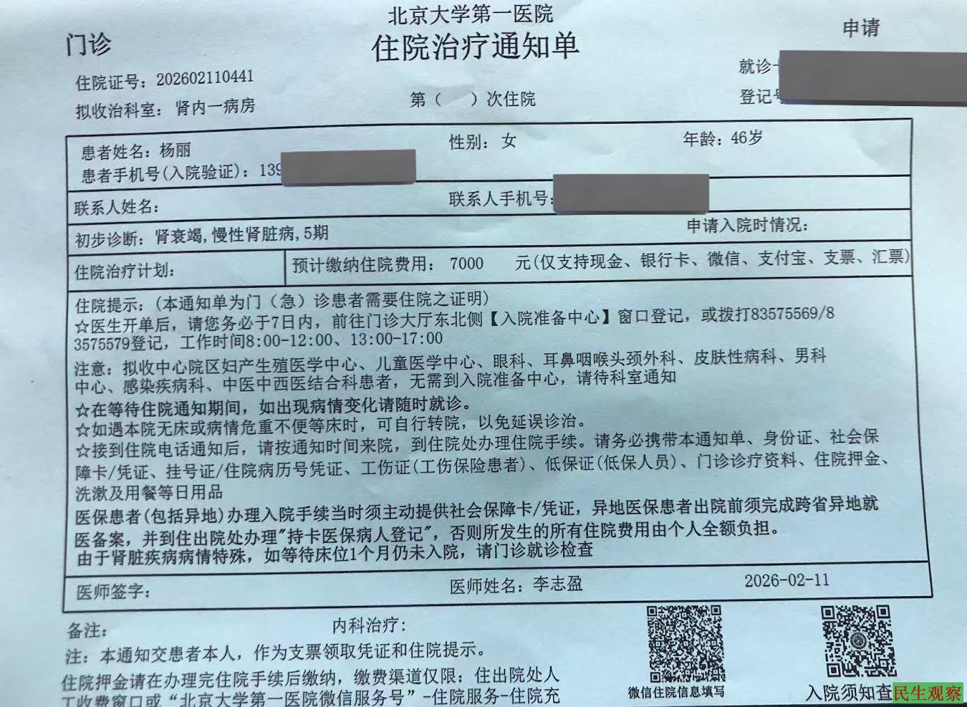 2月14日,北京大学第一医院在医生开出住院通知4天后的今天,杨丽仍被拒绝提供透析治疗。目前已因严重浮肿完全无法行走,被迫全天躺在医院地上等待收治。