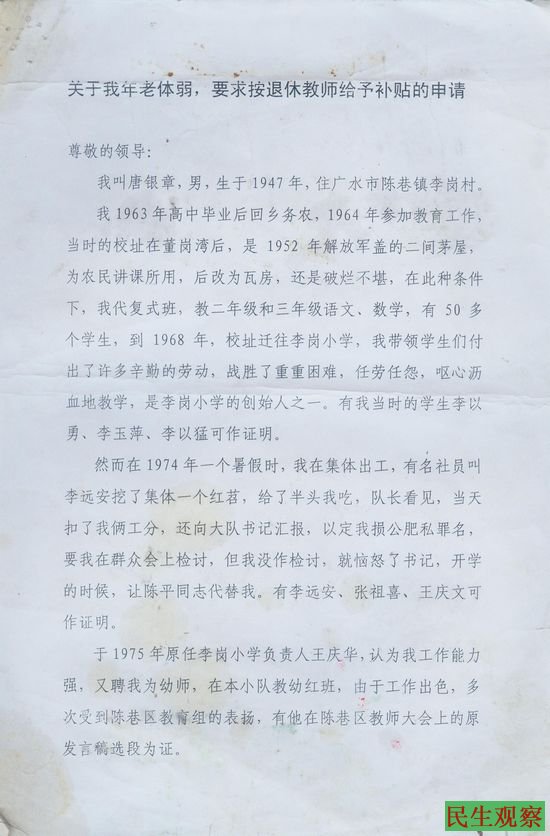 因为1974年就被清退回家,失去了民办教师的身份,尽管此后几十年中唐银章一直没有离开学生,但现在湖北许多民办教师有了养老保险等基本保障,但他却没有。唐老师为此近年开始了上访,以下是他的相关材料: