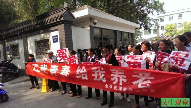 据介绍,这几天到场的老师都是从教一、二十年的代课老师,还有部分幼儿代课老师。陈老师说她是1982年开始任教的,干到2008年,从教20多年。现在不仅什么都没有,连身份都被政府说成是代课人员、农民。