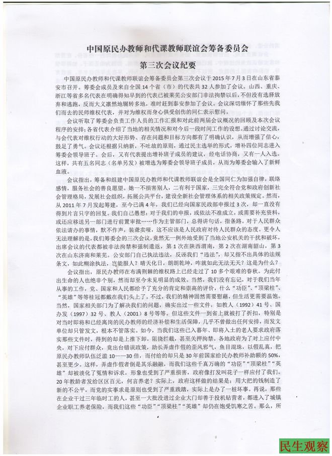 以下是前不久进行的中国原民办代课老师联谊会筹备委员会第三次会议纪要