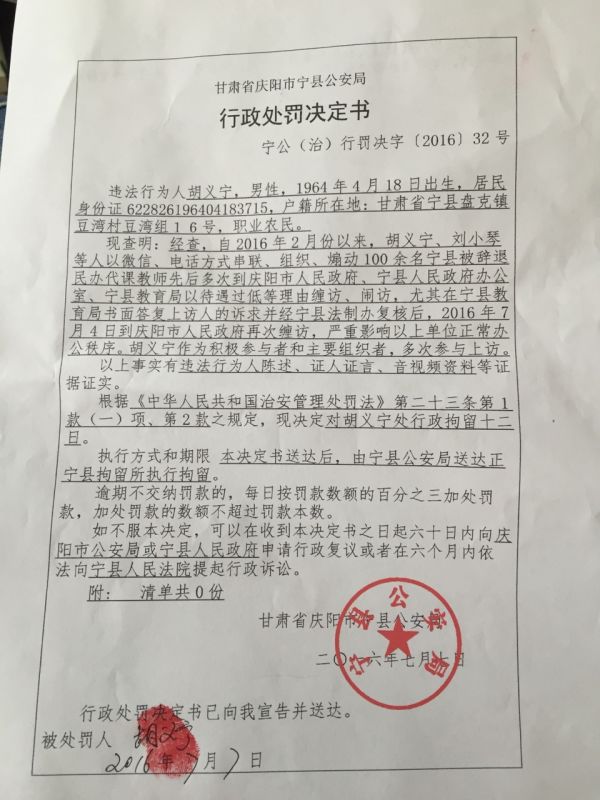 胡义宁的处罚决定书显示,2016年2月以来,胡义宁多次组织当地民办代课教师到庆阳市、宁县政府、教育局上访。7月4日又到庆阳市政府“缠访”,扰乱了单位秩序,故对其行政拘留12天。胡义宁的妻子说宁县还有另二位老师同时被拘留。
