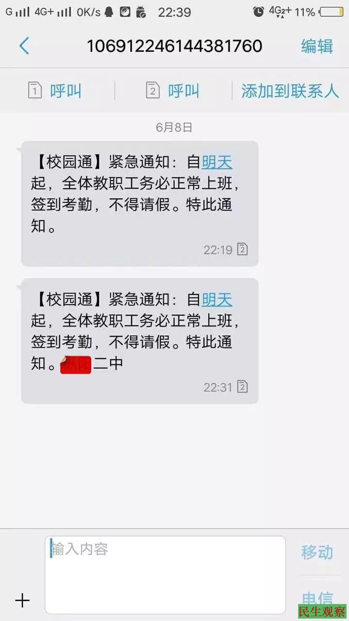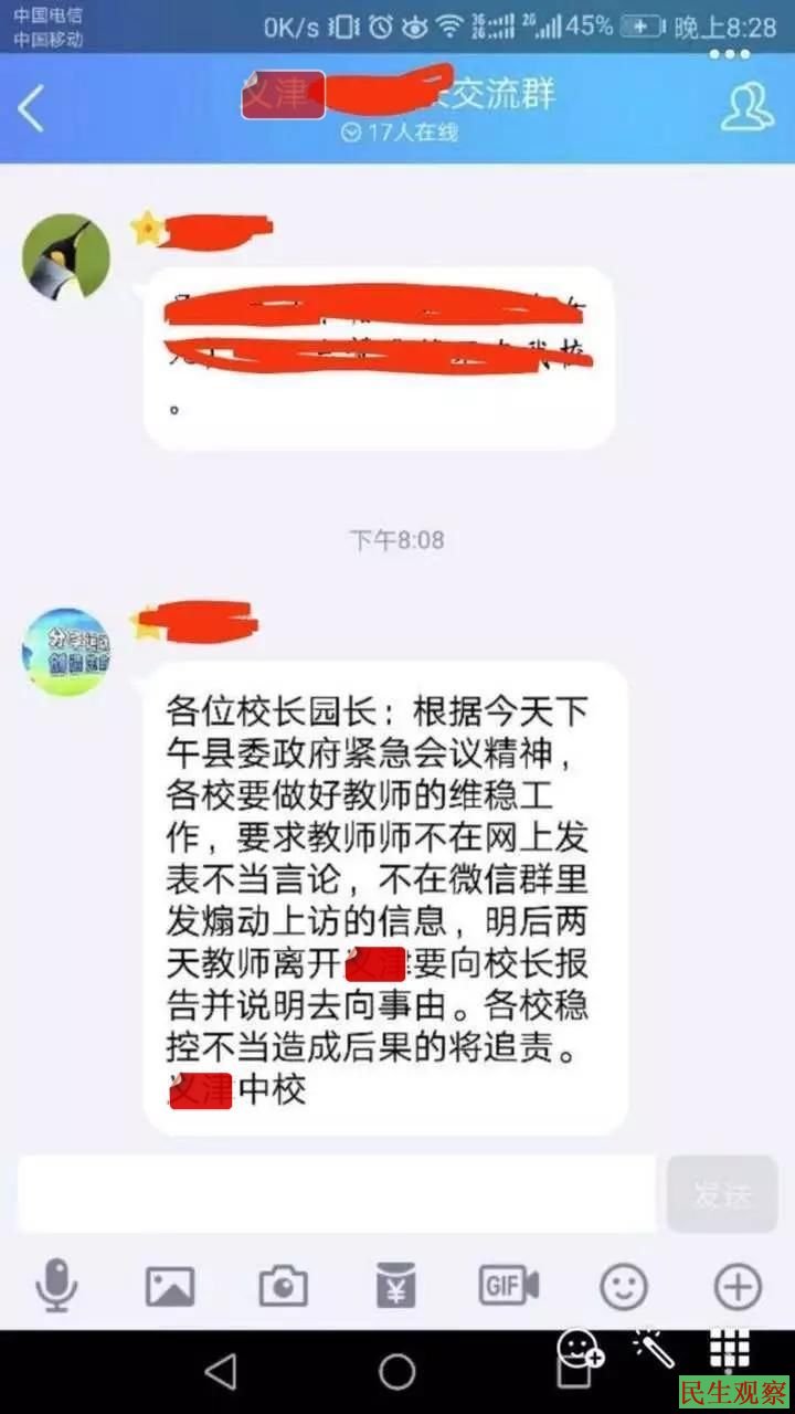 2018年6月8日,安徽省铜陵市教师微信群传出通知:“各位校长园长:根据今天下午县委政府紧急会议精神,各校要做好教师的维稳工作,要求教师不要在网上发表不当言论,不在微信群里发布煽动上访的信息,明后两天教师要离开XX要向校长报告并说明去向事由。各校稳控不当造成后果的将追责。”此外,各学校微信群还传出紧急通知:自明天起,全体教职工务必正常上班,签到考勤,不得请假。特此通知。
