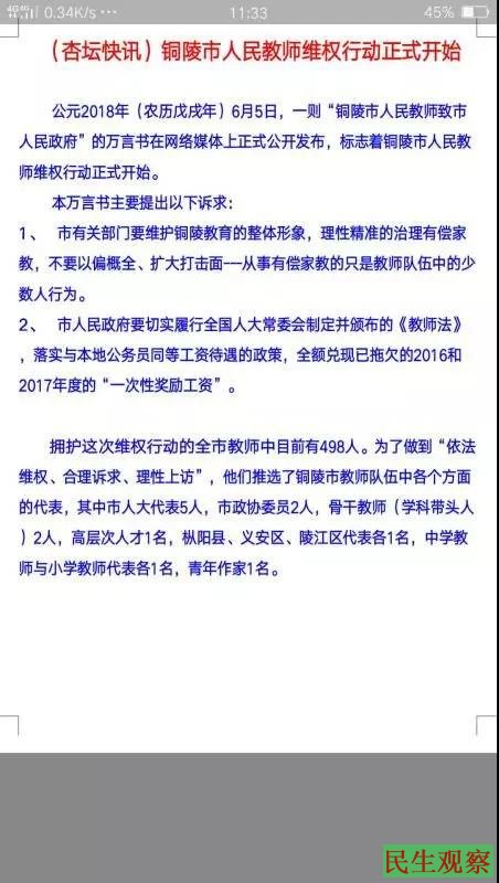 【民生观察2018年6月9日消息】本网获悉,2018年6月8日,安徽铜陵市各区县教师推选出了多名代表,准备在6月9日至10日到市政府和教育局上访讨薪,但当日这些代表及部分教师即被维稳控制。