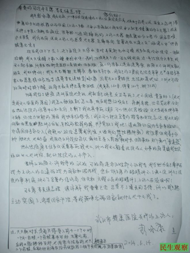民生观察工作室2014-6-19消息:本工作室重点关注的武汉访民彭咏康(谁来拯救彭咏康—法院·法制捍卫者的耻辱http://aaa.aetdhfjgk.cf/a/lanmu68/201207/2013/0615/7647.html)近日又传出消息,现仍在精神院院中的彭咏康设法向外传书,致信习近平、李克强,要求尽快将她释放,因为她在精神病院中已被关了六年多了。