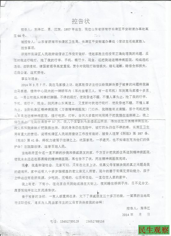山东访民房泽江为妻子讨公道被送精神病院 |