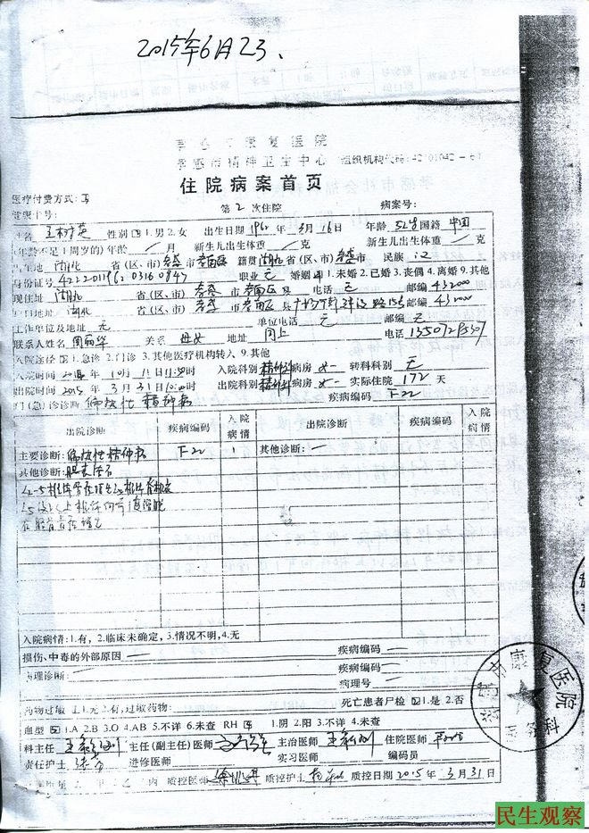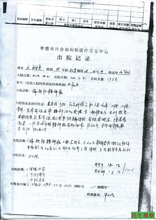 民生观察工作室2015/6/26消息:本工作室一直关注的湖北省孝感市民王树英被精神案又传来新消息,近日王树英成功从医院拿到了她2014年10月11日至2015年3月31日,在孝感市康复医院(孝感市精神卫生中心)被住院“治疗”172天的病历等相关资料。