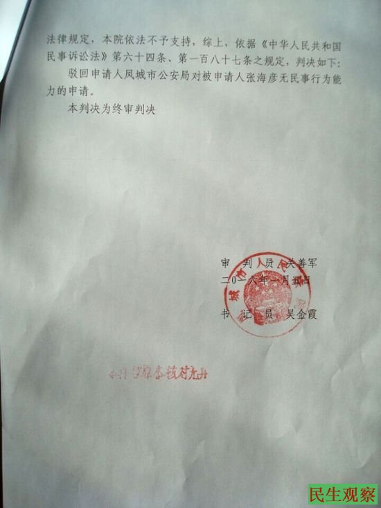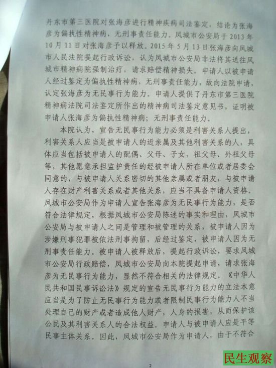 民生观察工作室2016/1/10消息:辽宁凤城访民张海彦,多次被凤城公安分局非法强制送到精神病院强制治疗,为此,2015年5月13日,张海彦提起来行政诉讼,把凤城公安分局列为被告,凤城市人民法院依法立案受理了该案。