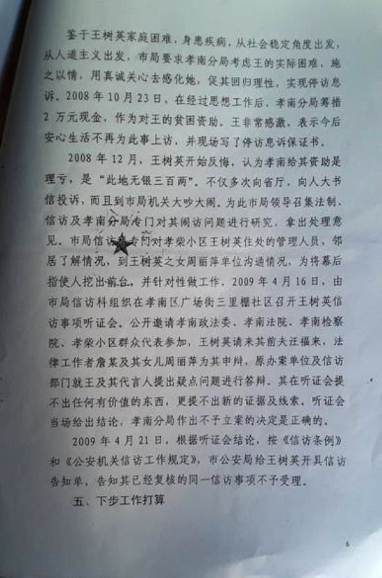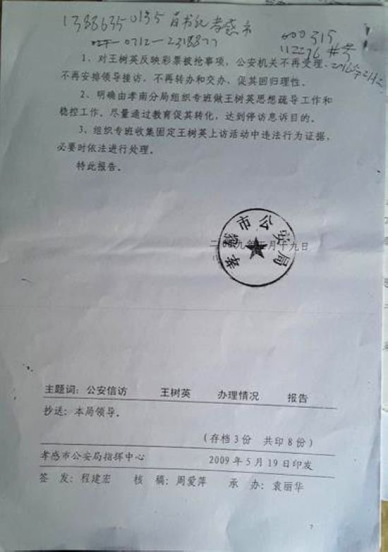 王树英说,把她关到精神病院出乎她的意料,因为2009年孝感市公安局的内部材料说,我的案子他们不受理不接访,逼我息诉罢访,并组织专班人马收集固定我上访活动中违法行为证据,必要时依法处理。