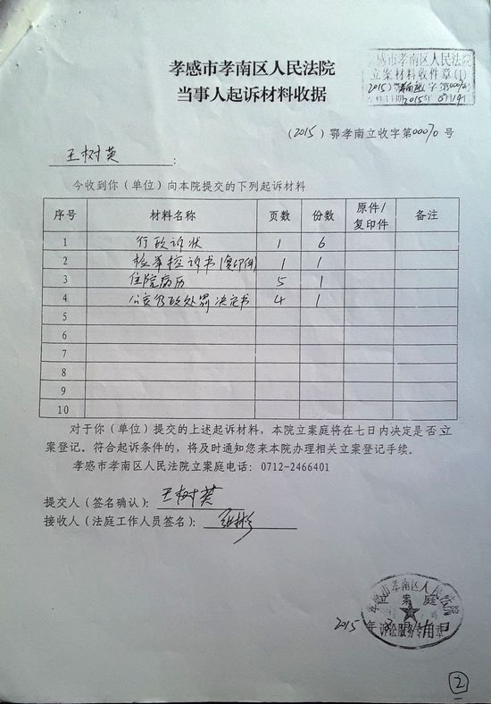 王树英说,我是2015年3月31日从精神病医院出来的,出来他们又强制把我送到秦皇岛老家不许我回湖北,怕错过了诉讼时效,我冒险跑回来起诉,结果法院就不给我立案,收了我材料还不给收据,我要了好几次才给我。因为我老去找他们要求立案,后来又逼着我把材料拿走,把收据还给他们。我问他们为啥不立案,还逼着我退材料,他们说是政府行为他们不管。我找了人大和市法院都让我找孝南区法院,孝南区法院让找市法院,到想推着没人管。