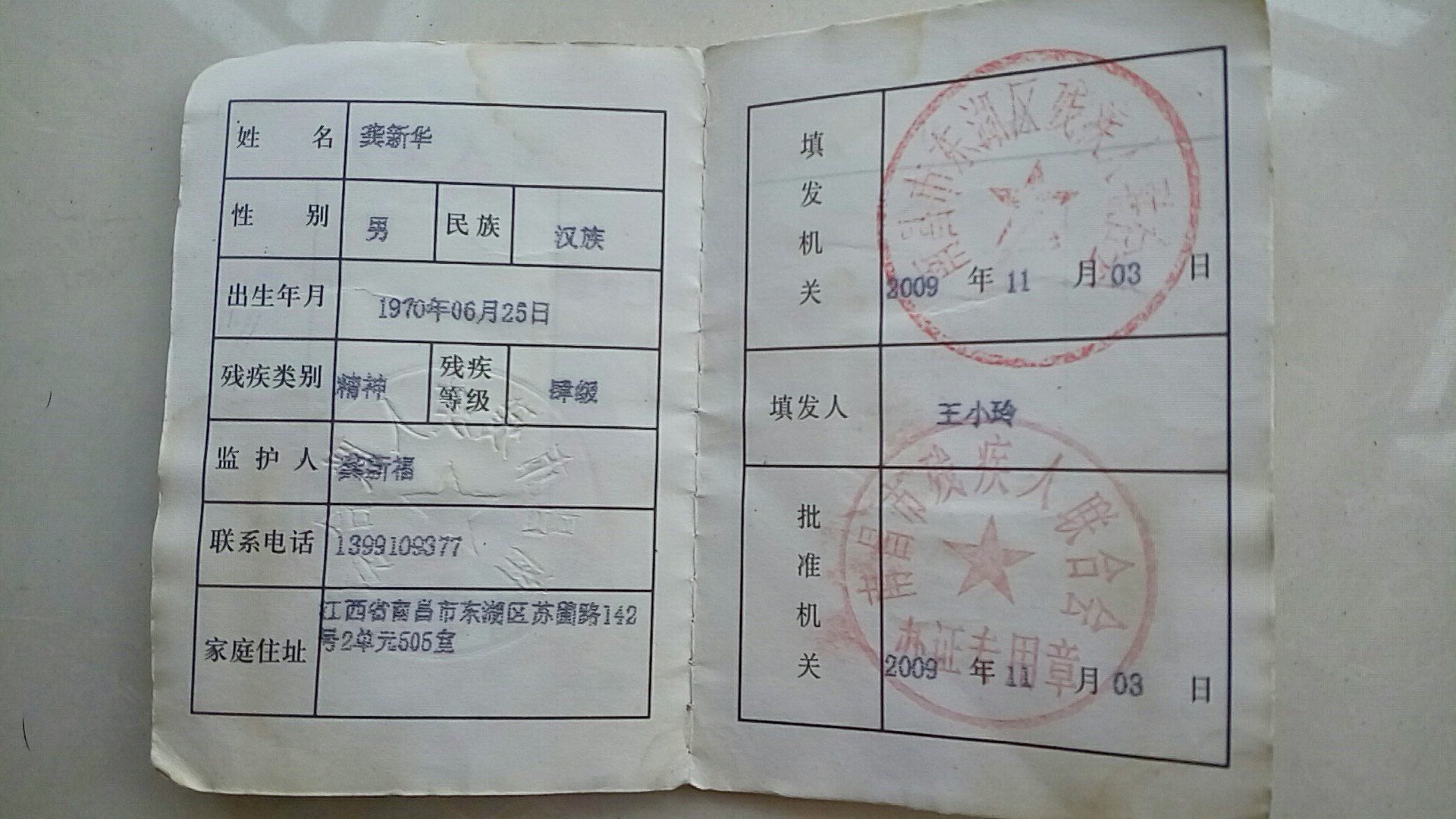 据公开消息显示,龚新华曾于2008年12月至2011年3月的两年零四个月间,被南昌警方“关押”在江西省精神病院“治疗”,并对其发放了残疾人证(四级精神病类)。