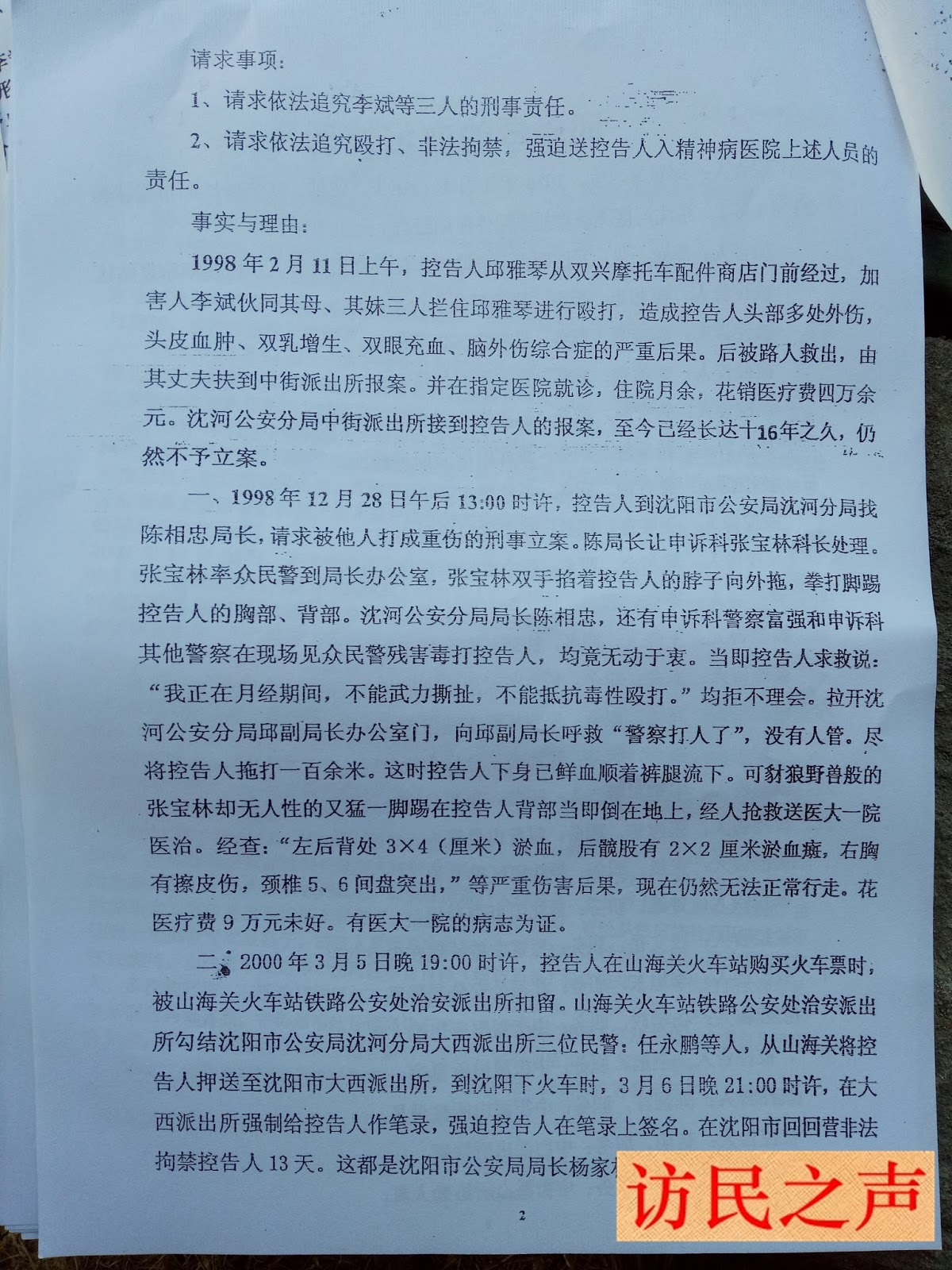 由于派出所迟迟没做答复, 1998年12月28日,邱雅琴反映到沈河分局,要求陈相忠局长依法办案,抓捕李斌,追究派出所不作为的责任。结果在局长办公室被申诉科科长张宝林当着局长的面掐脖子,拳脚相加暴打一顿。邱雅琴急呼“警察打人了”包括局长在内的多名警察在场却无人制止。邱雅琴继而哀求,“不要打我了,我在月经期经不住打”但张宝林并没有停手,还把她从2楼连拖带打扔到大门外。此时邱雅琴下身流血不止,血水顺着裤腿淌到了地上。但张宝林并没有因此心生不忍,反而飞起一脚踹在了邱雅琴的背上,至邱雅琴当场昏厥。后经送医抢救,治疗医药费花去了8万余元也未能完全康复,留下了终身残疾。