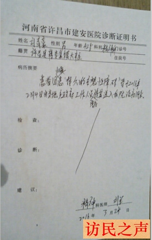 第三次是2016年的6月14日下午,这次他是在中南海被送到马家楼。当晚8点左右,许昌截访人员从马家楼把他接出来,镇政府工作人员用车把他送到洛阳市精神卫生中心。进去后在精神病4科进行了最简单的常规检查(心电图,量血压、体重、脑电图)。期间他对大夫说:“我对政府那个鉴定不服,那是造假的,如果第三方确定我有病的话我配合用药,没有的话你们不能给我治疗,要放我出去。”好在大夫良知未泯,没有强制给他用药,只是住院观察。2016年9月15日,因他在医院把腿摔伤行走不方便,镇政府才主动接他出院。