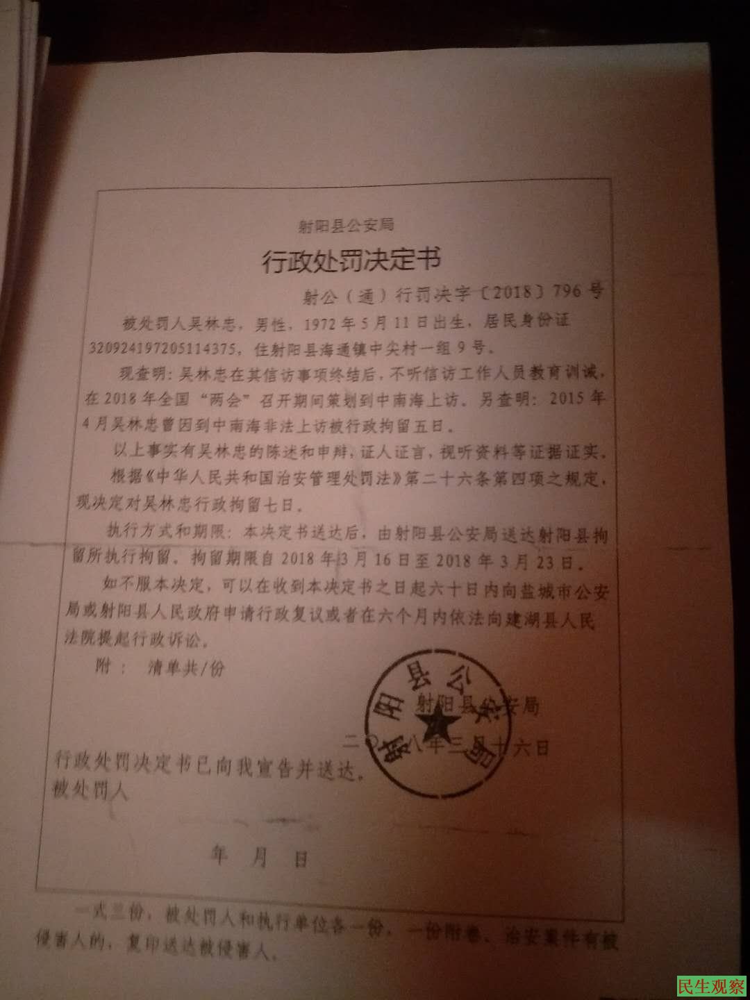 【民生观察2018年4月23日消息】本网获悉,江苏省盐城市射阳县海通镇中尖村访民吴林忠近期将到北京上访,主要反映他被射阳县工商局非法剥夺经营权,以及在正常信访期间,遭到射阳县当地维稳部门打击报复等问题。