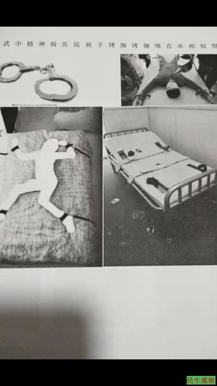 喻凤被拖着穿过一道道铁栅门后,被带进一个铁窗紧闭房间。“四个彪心大汉把我提包、身上的钱、手机和所有的东西被强行搜走,将我按倒在一张病床上,病床四角有钉着的四个磁性脚铐手铐,磁性搭扣一按磁性手脚铐机关,四肢就被牢牢扣上锁在病床四周,人成了大字形状(见相似图),连动弹一下都是奢侈”:喻凤回忆道。