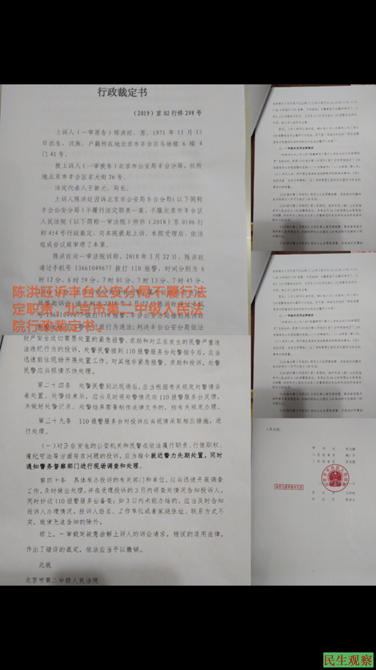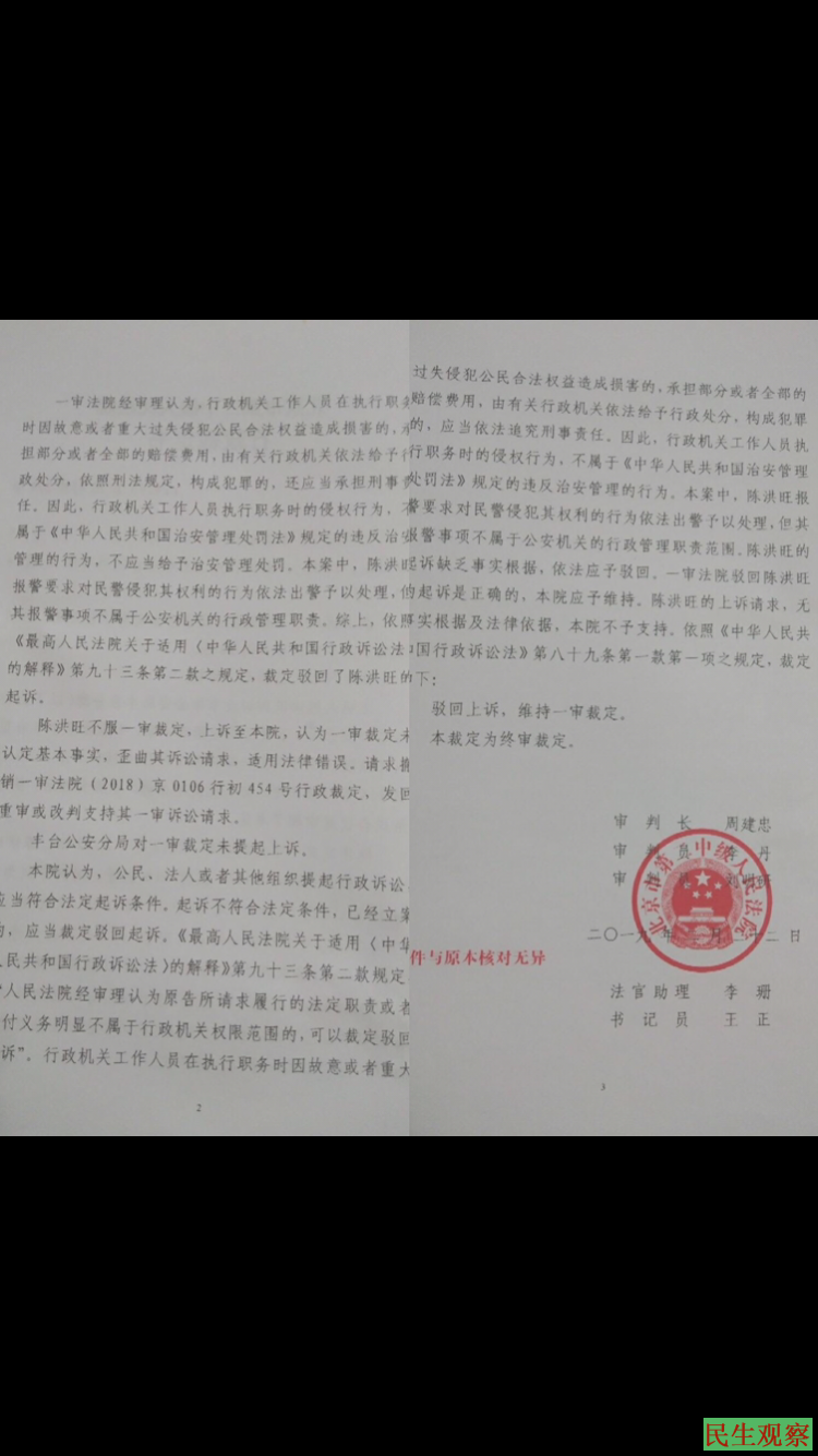 2018年12月14日,北京市丰台区人民法院行政裁定书(2018)京0106行初454号,称报警事项不属于公安机关管理职责。陈洪旺对此不服,提起上诉。