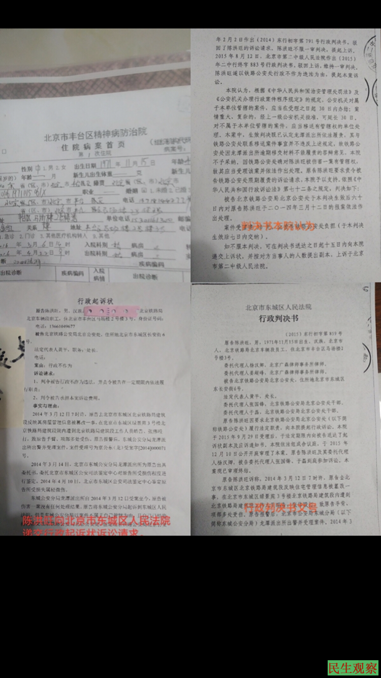 2014年3月12日因反应房产被篡改,被打伤,事件发生地属北京铁路公安处管辖,北京铁路公安处始终对陈洪旺被伤害案不予处理。就此请求北京市东城区人民法院判令北京铁路公安处行政不作为,并责令北京铁路公安处在一定期限内依法履行法定职责。2016年1月19日北京市东城区人民法院行政判决书(2015)东行初字第859号一审判决支持了陈洪旺的诉讼请求。