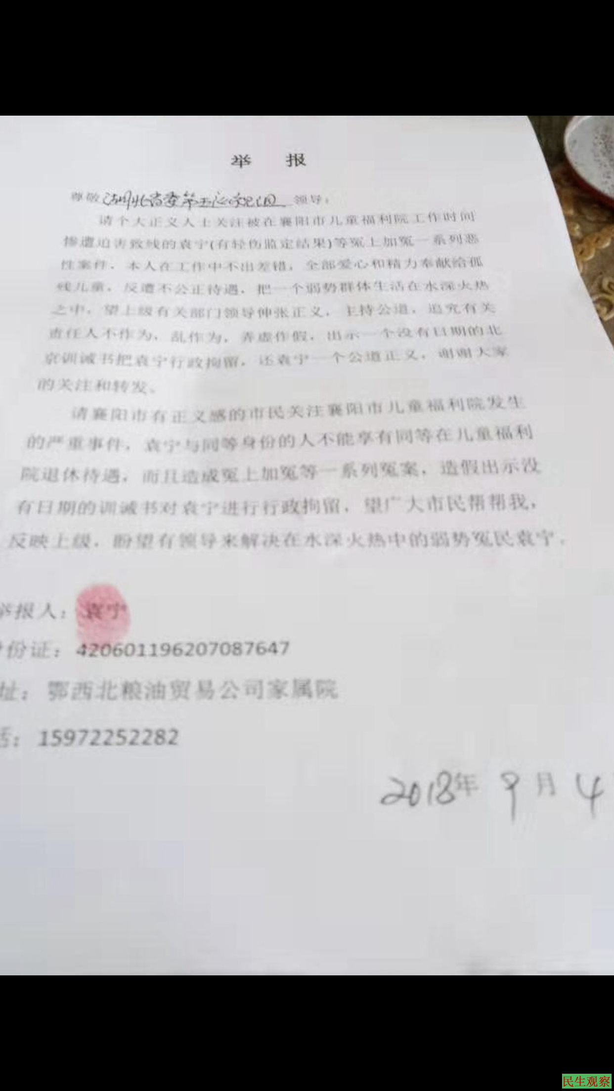 【民生观察2020年1月13日消息】湖北襄阳市儿童福利院职工袁宁,因退休待遇问题上访多年,期间遭当地维稳部门打击报复,被送进民政局下属精神病院关押3个月,被强行服用精神病药物,目前感觉身体不适。