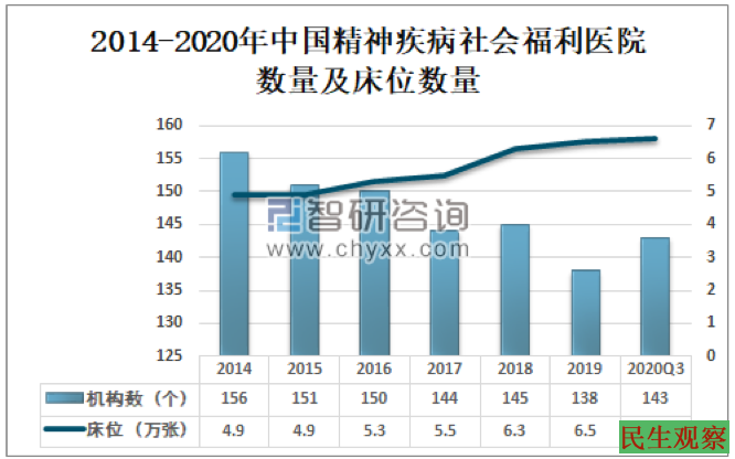 面对如此庞大的精神病人,中国精神医疗机构及从业人员情况是,据智研咨询发布的《2021-2027年中国精神病机构行业发展动态分析及市场前景规划报告》数据显示:2019年中国共有1545个精神病专科医院,较2018年增加了215个;2019年中国共有38个精神病防治所,较2018年增加了10个。2013-2019年精神病医院卫生人员数逐年增加,2019年精神病医院卫生人员数达到210806人,较2018年增加了26867人;2019年精神病防治所卫生人员数为2197人,较2018年增加了800人。2019年中国精神疾病床位数为6.5万张;2020年第三季度中国精神疾病床位数为6.6万张。