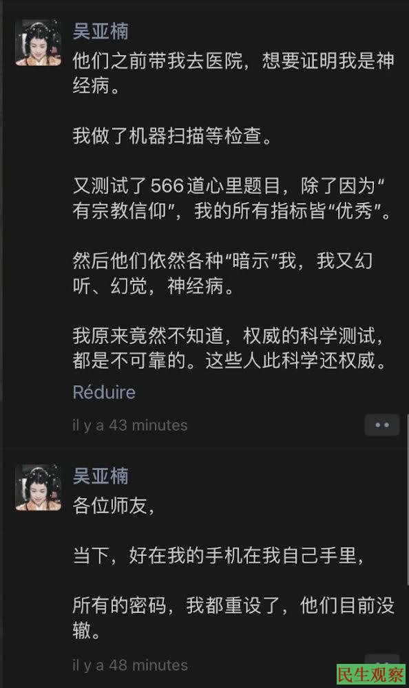 接着吴亚楠老师又继续发消息说:“各位师友,当下好在我的手机在我自己手里,所有的密码,我都重设了,他们目前没辙。”