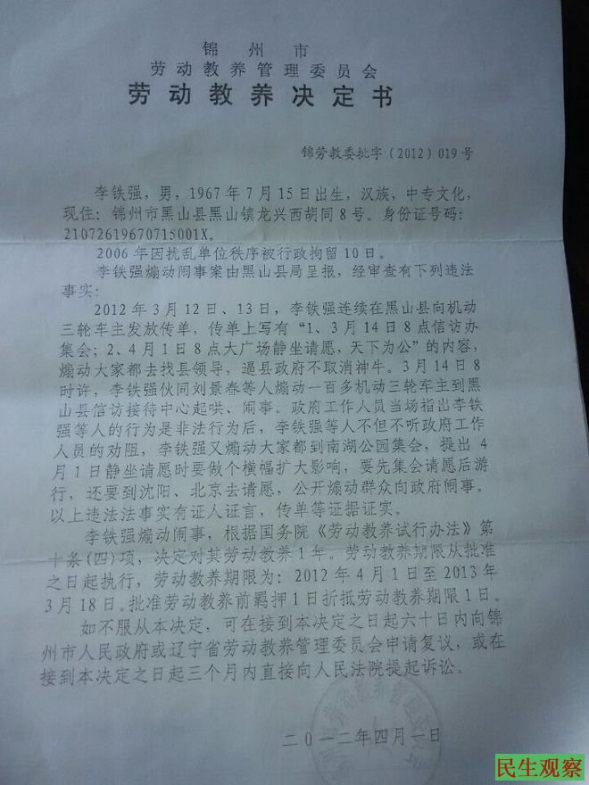 民生观察工作室2015/5/22消息:李铁强是辽宁省锦州市黑山县的珍闰维权工人代表,2012年7月被控散发传单、鼓动出租车司机示威请愿被原锦州市劳动教养管理委员会批准劳教一年。