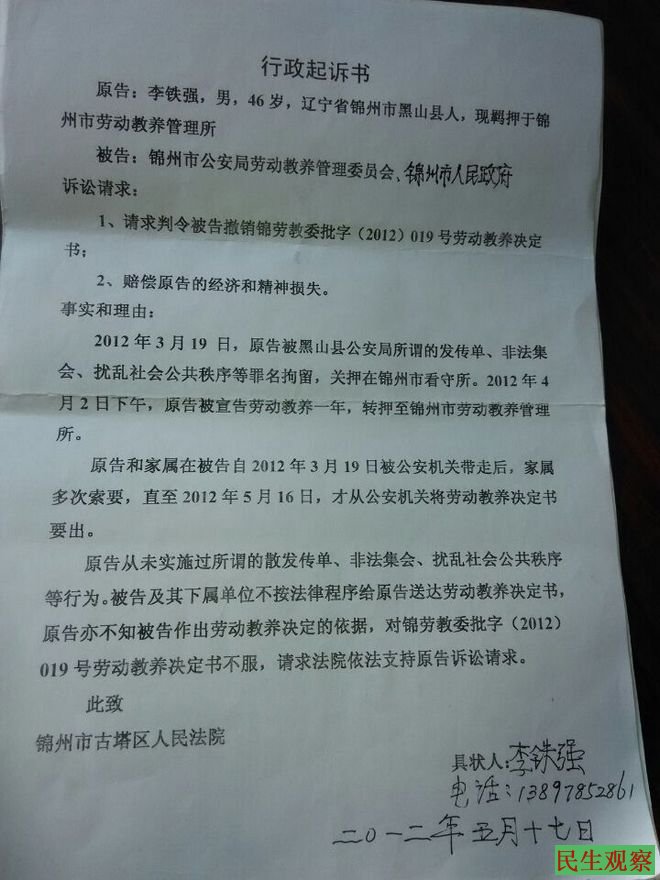 2012年被劳教时,李铁强就向锦州市古塔区法院提起了行政诉讼,状告锦州市劳动教养管理委员会,但当年被法院一口拒绝。