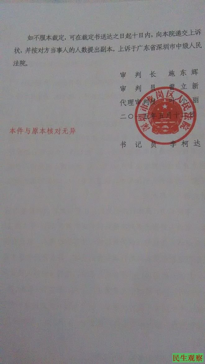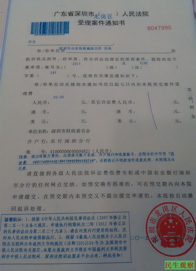 5月20日,当汪龙收到户口被正式注销的证明后,立即着手就户口已被注销这一行政行为的具体结果再行提起行政诉讼。5月25日,汪龙将准备好的起诉材料带到龙岗区法院,再经过该院法官阅读并请示立案庭领导之后,他的案件被当场决定立案。汪龙告诉民生观察工作室,案件还是需要立案庭领导同意之后,立案法官才在系统中操作立案的,法官当场向他打印送达了受理案件通知书、举证通知书等立案文书,并当场打印制作了给被告的应诉通知书、举证通知书等文书。汪龙表示,被告的法定举证期限是收到举证通知书之日起15天,在这期限内被告需要提交作出具体行政行为(即注销户口)的证据和依据。举证期限结束之后,法院合议庭将确定具体开庭时间开庭审理。对于汪龙起诉龙岗公安分局注销户口一案,民生观察工作室也将持续关注。