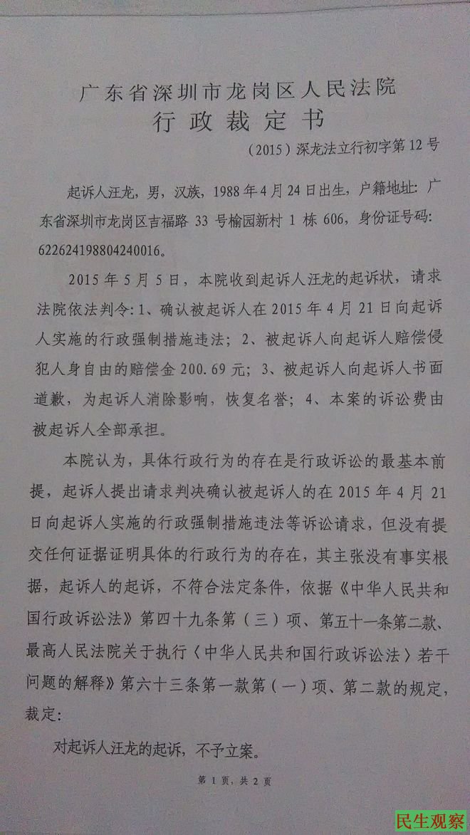 另据民生观察工作室了解,汪龙在早些时候起诉深圳市公安局龙华分局违法采取强制措施一案,在汪龙起诉到深圳市龙岗区法院之后,亦遭到了该院不予立案的裁定。汪龙在被释放的第二天,也就是4月21日,当天正好是他的生日,汪龙应约与网友在位于深圳市龙华新区的深圳北站附近聚餐,但饭还没有吃完却遭遇了龙华公安分局的违法强制措施被带到龙华民治派出所限制人身自由。汪龙认为,龙华公安分局在整个采取强制措施过程当中存在违法,遂起诉至龙岗区法院。根据《行政诉讼法》第十九条规定“对限制人身自由的行政强制措施不服提起的诉讼,由被告所在地或者原告所在地人民法院管辖”,汪龙表示,这也是他第一宗在原告所在地法院(即龙岗区法院)起诉的行政案件。