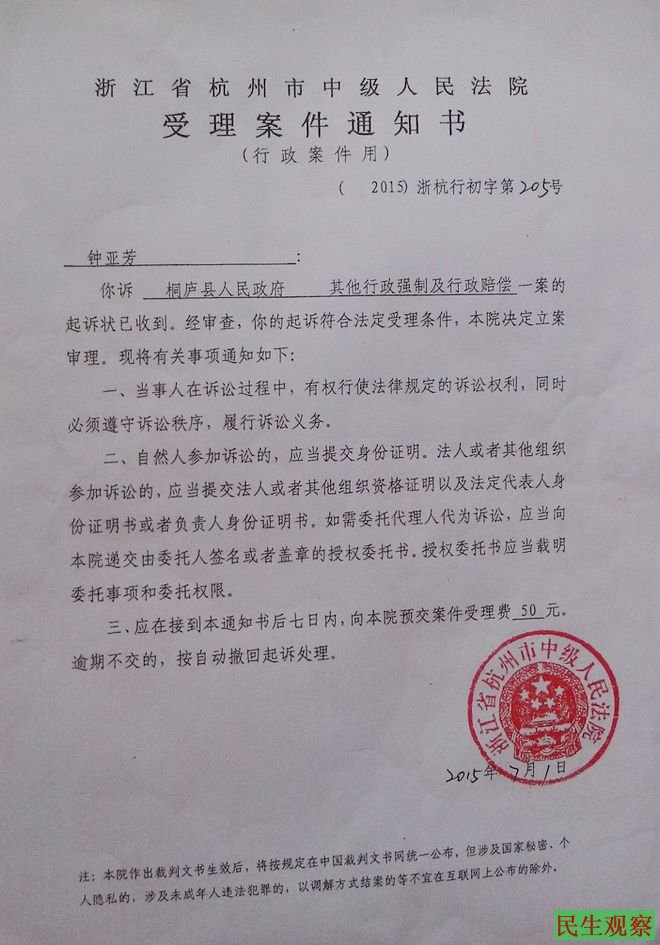 原告:钟亚芳,女,汉族,1967年3月5日出生,住浙江省桐庐县桐庐镇惠民小区7幢510室,电话15306516215。