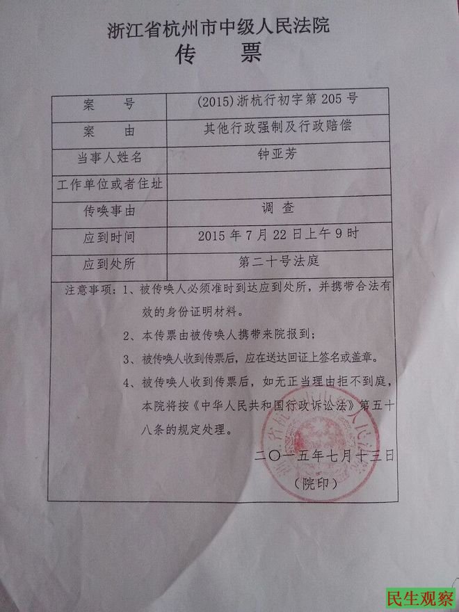 7月13日,杭州市中级法院给钟亚芳送达传票,要求她于今天到法院参加庭前调查。但是由于上述状况,钟亚芳根本无法前往杭州,她不得不提前向法院邮寄无法到庭的说明。