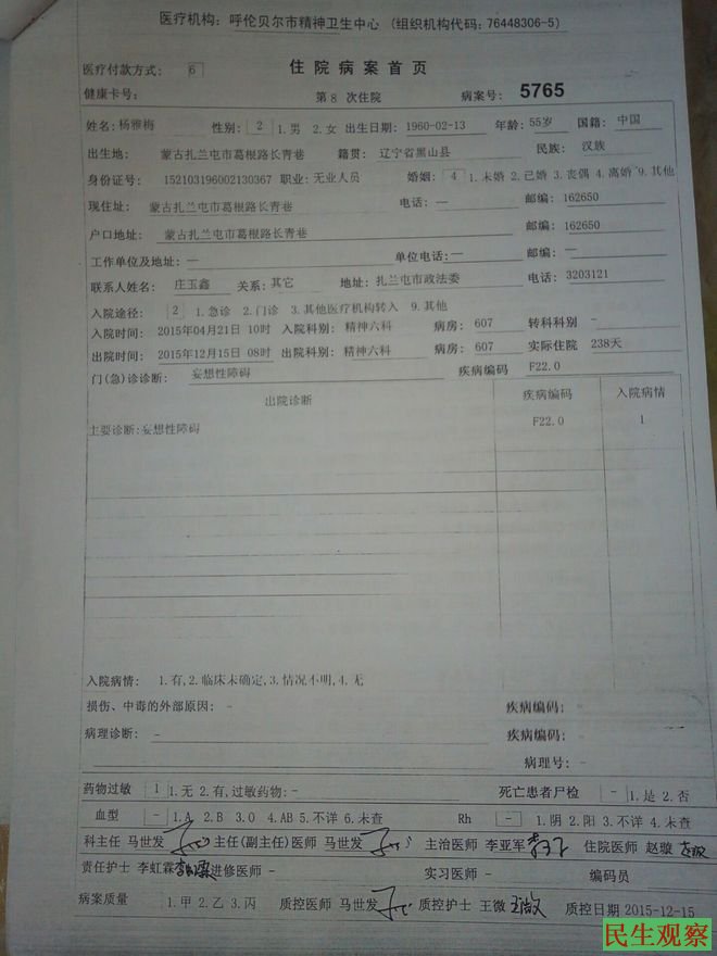 08年又考取陕西服装艺术职业学院,又因母亲被诬陷精神病,迫害囚拘呼伦贝尔市精神病院,二度失学,录取号《T080514》至今无职业。