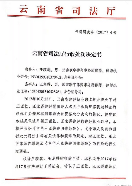 王理乾、王得龙被云南省司法厅吊销律师证 |