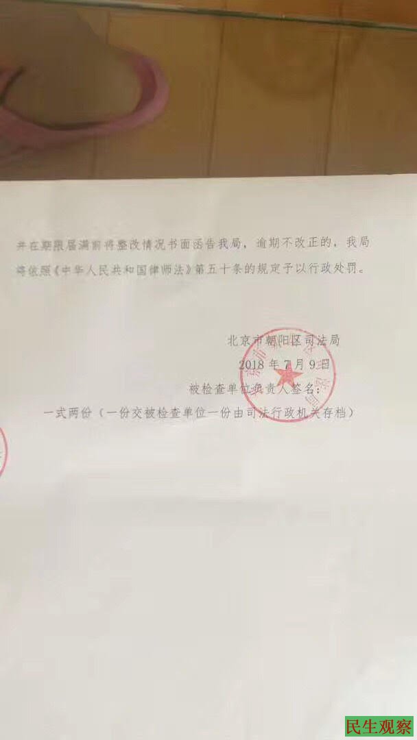 根据蔺其磊律师提供的信息,今日(7月11日)下午两点,在外陪伴家人旅游的蔺其磊律师收到律所工作人员发来的一份落款为北京市朝阳区司法局、时间为2018年7月9日的《限期整改通知书》。