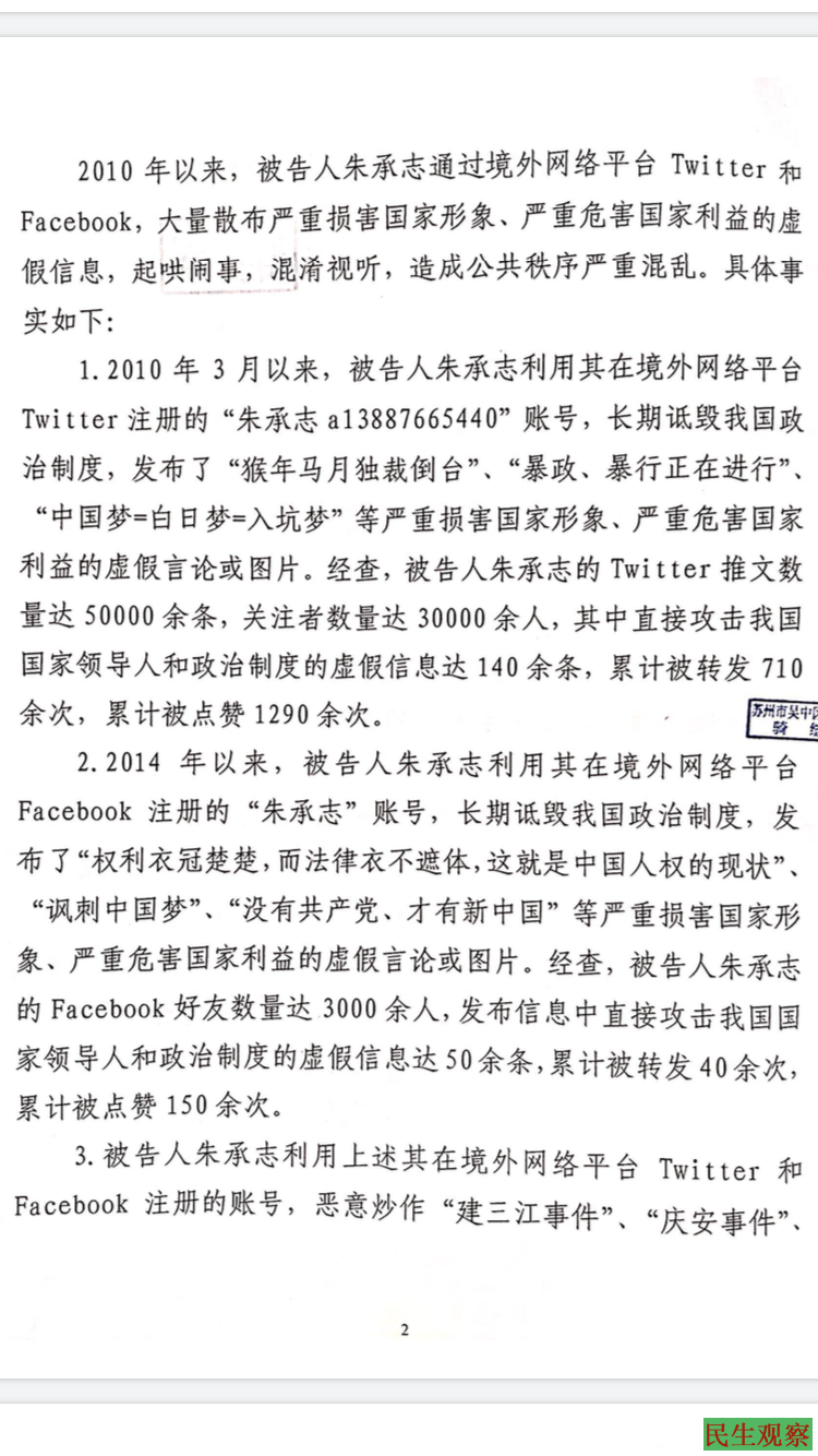 【民生观察2019年7月19日消息】湖南著名维权人士朱承志因去年到苏州灵岩山为林昭扫墓,而被江苏苏州当局以涉嫌“寻衅滋事”逮捕,4月份进入“审查起诉阶段”后,今家属透露苏州市吴中区检察院对朱承志的《起诉书》,起诉罪名多来源于境外网络平台推特(Twitter)及脸书(Facebook),只字未提朱承志此次因前去苏州林昭扫墓而被捕。
