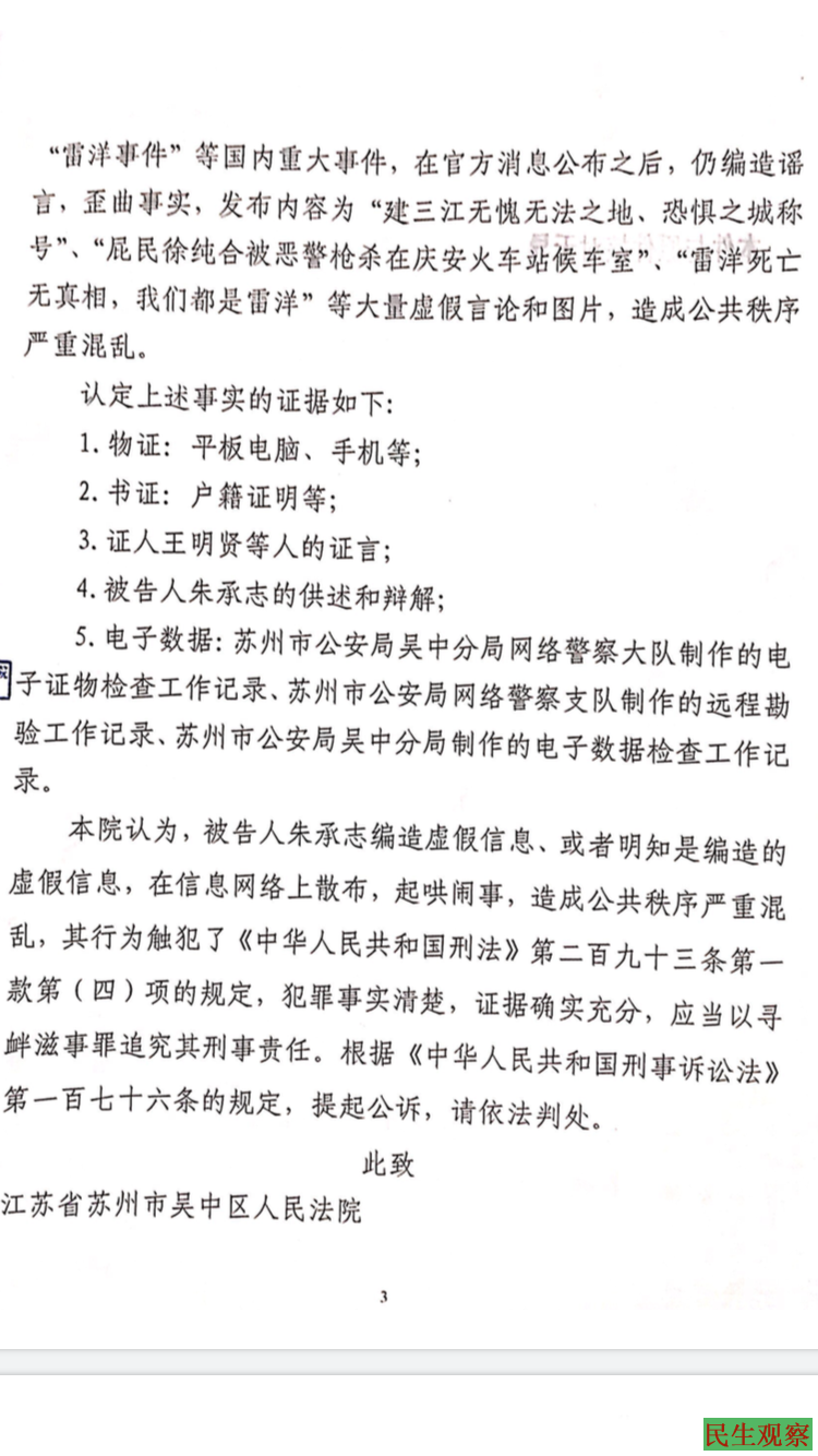 江苏苏州吴中区法院对朱承志的《起诉书》全文如下: