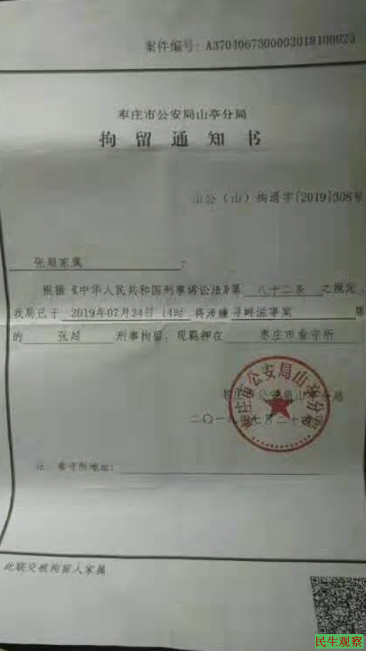 【民生观察2019年8月9日消息】本网获悉,山东枣庄民主人士张超欲前往德国考察,于2019年7月24日被枣庄市公安局山亭分局以涉嫌寻衅滋事罪刑事拘留,现羁押在枣庄市看守所。