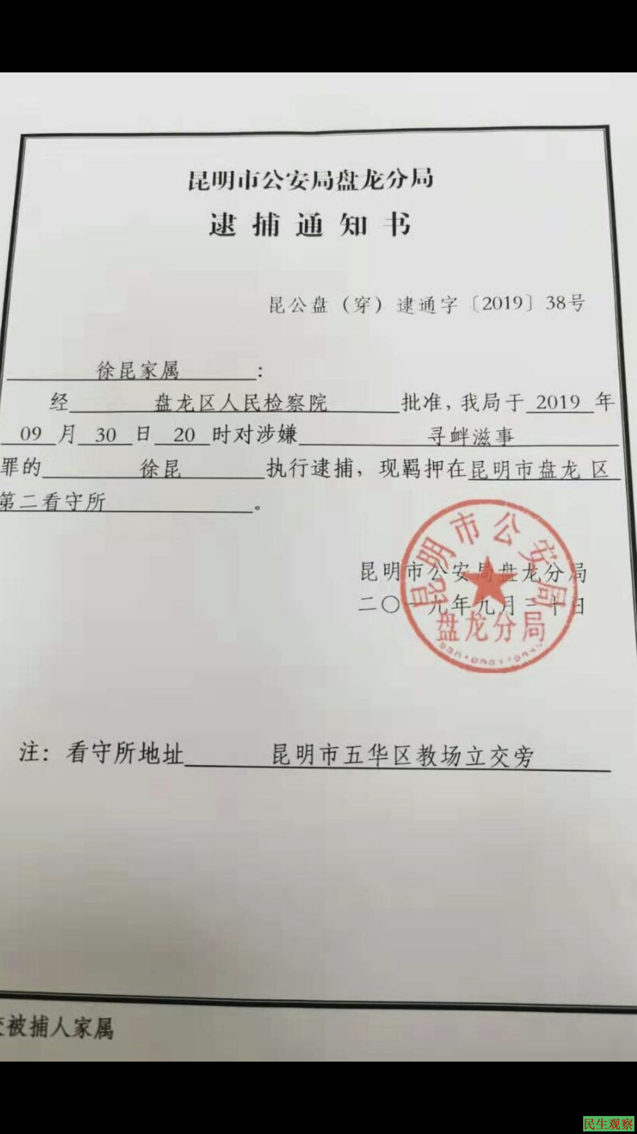 八月三十日下午二点左右,盘龙分局国保大队长杨晶(音)、民警刘凯迪(音)、穿金派出所民警田川(音)三人来到拘留所,将我从2017年8月5日开始注册推特到2019年8月9日期间所有的推特截图拍照,让我签字,过程摄像,持续到晚上九点钟,后带我到国保大队,后到派出所,简单做了笔录,第二天31号下午以“寻衅滋事”的罪名刑事拘留,把我送到看守所,没有解释原因。九月三十日逮捕。