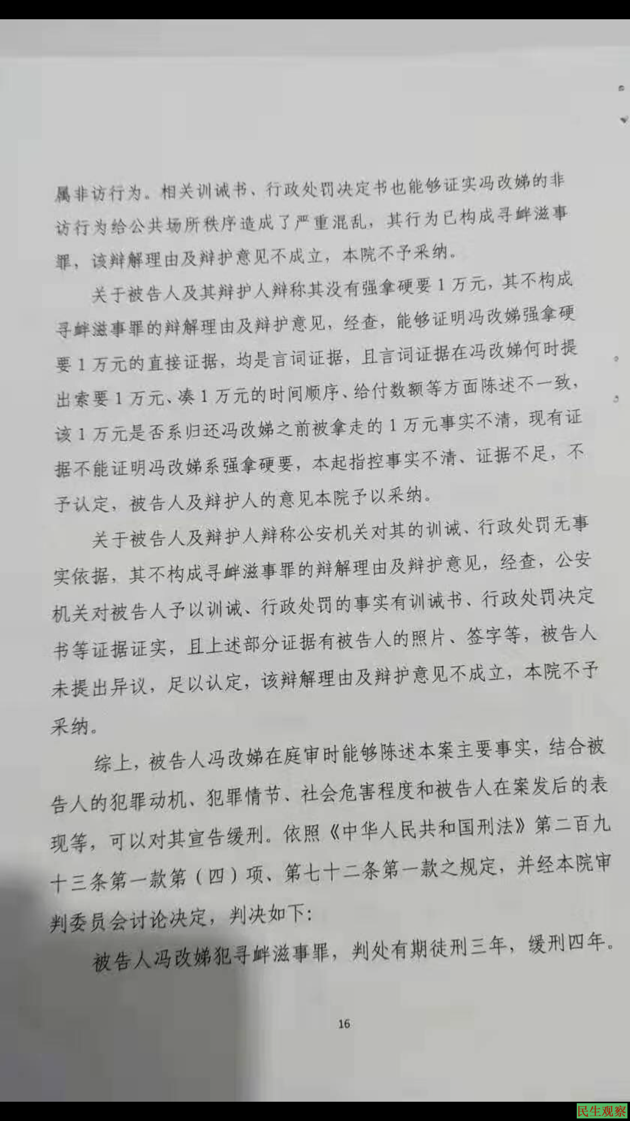 该案历经四年零四个月时间,昨日,冯改娣案二审终于宣判,其被以寻衅滋事罪判处有期徒刑三年缓刑四年。