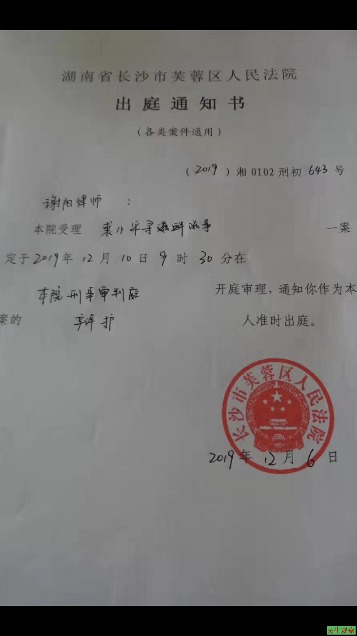 据謝阳律师透露,周四(12月5日)突然收到长沙市芙蓉区法院的电话通知,法院将于下周一、二(12月9日、10日)开庭审理裘小平涉嫌“寻衅滋事案”,并以商量的语气询问謝阳律师何日(下周一、二)方便出庭,此举极其反常。