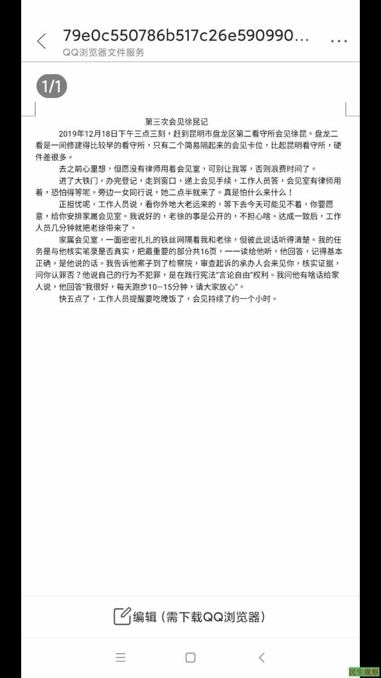 第三次会见情况如下: 2019年12月18日下午三点三刻到,赶到昆明市盘龙区第二看守所会见徐昆,盘龙二看是一间修建的比较早的看守所,只有两个简易隔起来的会见卡位,比起昆明看守所硬件差很多。 去起之前心里想,但愿没有律师用会见实,可别让我等,否则浪费时间了,进了大铁门,办完登记,走到窗口,递上会见手续,工作人员答,会见室有律师用着,恐怕得等着,旁边一女同行说:她两点半就来了,真是怕什么来什么。 正担忧呢!工作人员说:看你外地大老远来的,等下去今天可能见不着,你要愿意给你安排家属会见室,我说好的,老徐的事是公开的,不担心啥,等下去今天会见不着,达成一致后,工作人员几分钟就把徐昆带来了。 家属会见室,一面秘密扎扎的铁丝网隔着我与老徐,但彼此说话都听的清楚,我的任务是与他核实笔录是否真实,把最重要的部分共16页,一页一页读给他听,他回答,记得基本正确,是他说的话,我告诉他案子到了检察院,审查起诉的承办人会来见你,核实证据。问你认罪否?他说自己的行为不犯法,是在施行宪法,言论自由的权利,我问他有啥话给家人谈,他回答,我很好,每天跑步10-15分钟,请大家放心,快五点了,工作人员提醒要吃饭了,会见持续了约一个小时。