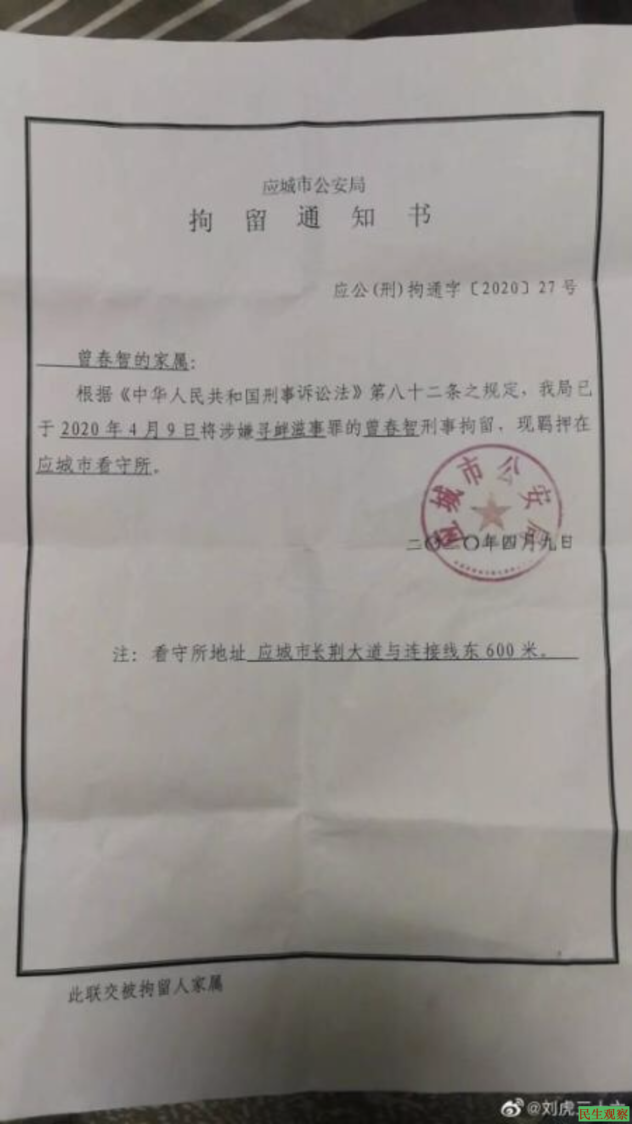 根据应城市公安局出具的拘留通知书显示,曾春智是在2020年4月9日被应城市公安局以涉嫌寻衅滋事罪刑事拘留的,现羁押在应城市看守所。