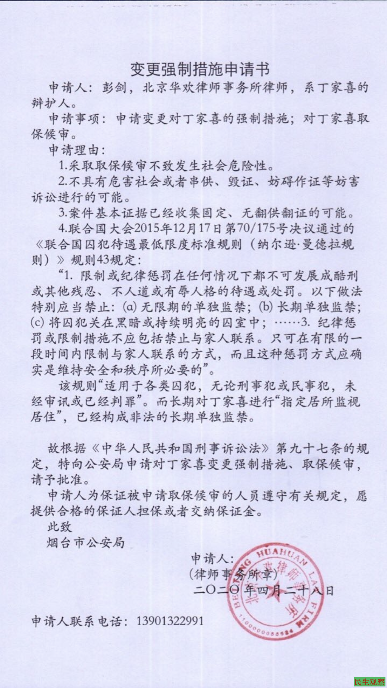 【民生观察2020年5月1日消息】日前,“厦门聚会案”当事人之一丁家喜的辩护人彭剑律师向“12.13”专案办案单位山东烟台市公安局递交《变更强制措施申请书》,要求烟台警方对丁家喜变更强制措施以及对丁家喜取保候审,不过警方对申请暂未回应。