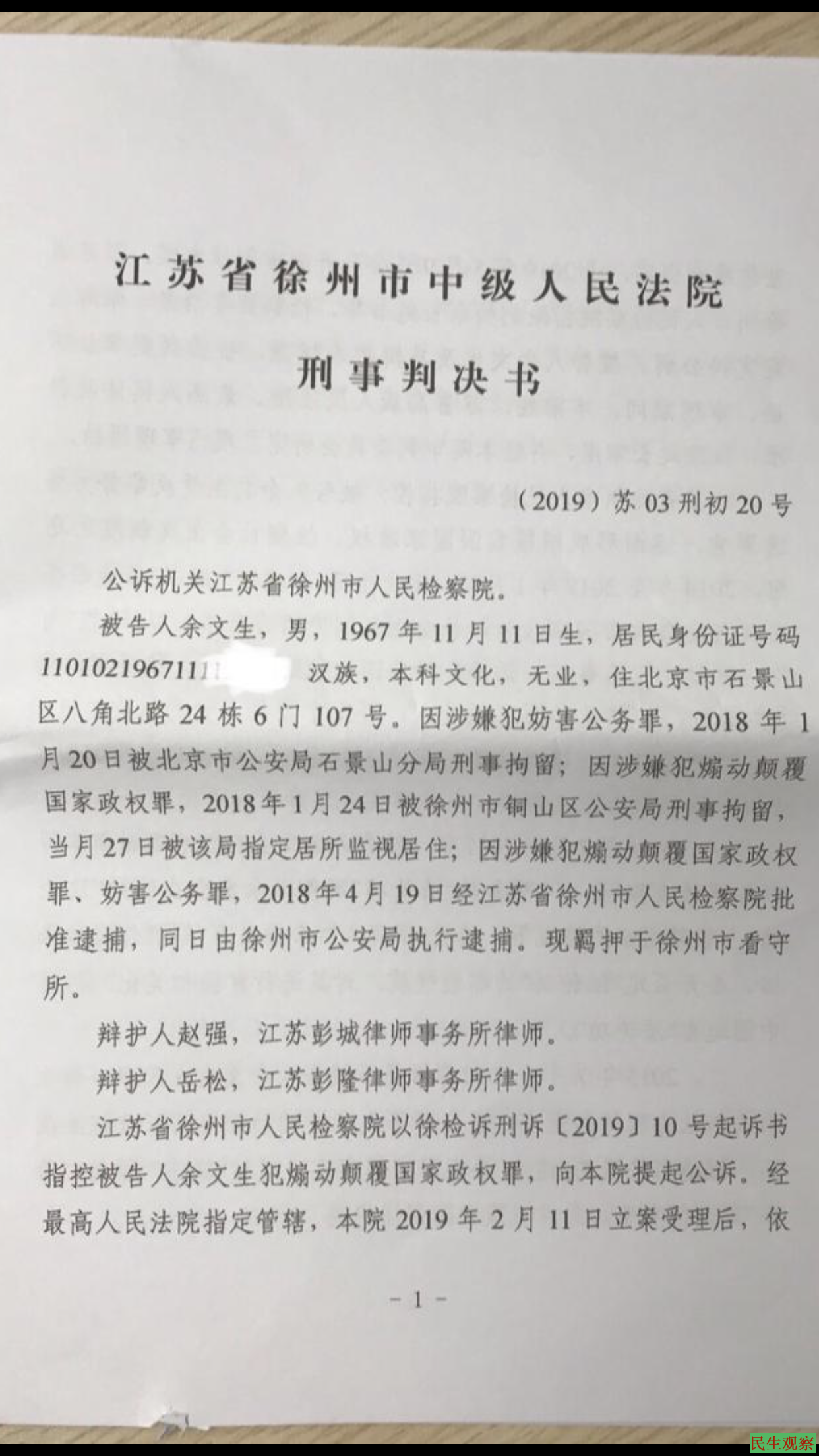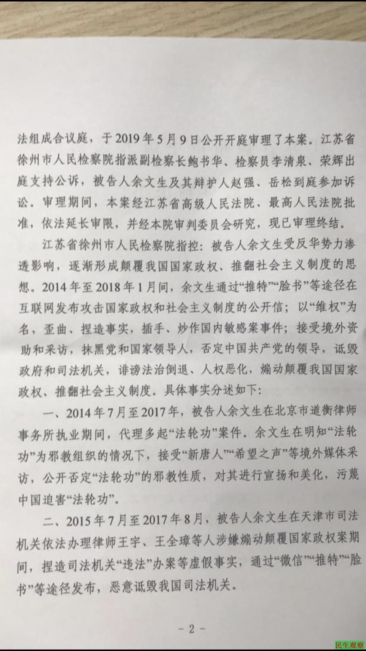 【民生观察2020年9月6日消息】本网获悉,余文生于2018年1月19日被捕入狱至今,罪名是“煽动颠覆国家政权罪”。2019年5月9日在徐州市中院被秘密开庭后2020年6月17日判处有期徒刑4年,剥夺政治权利3年。现被关徐州市看守所。