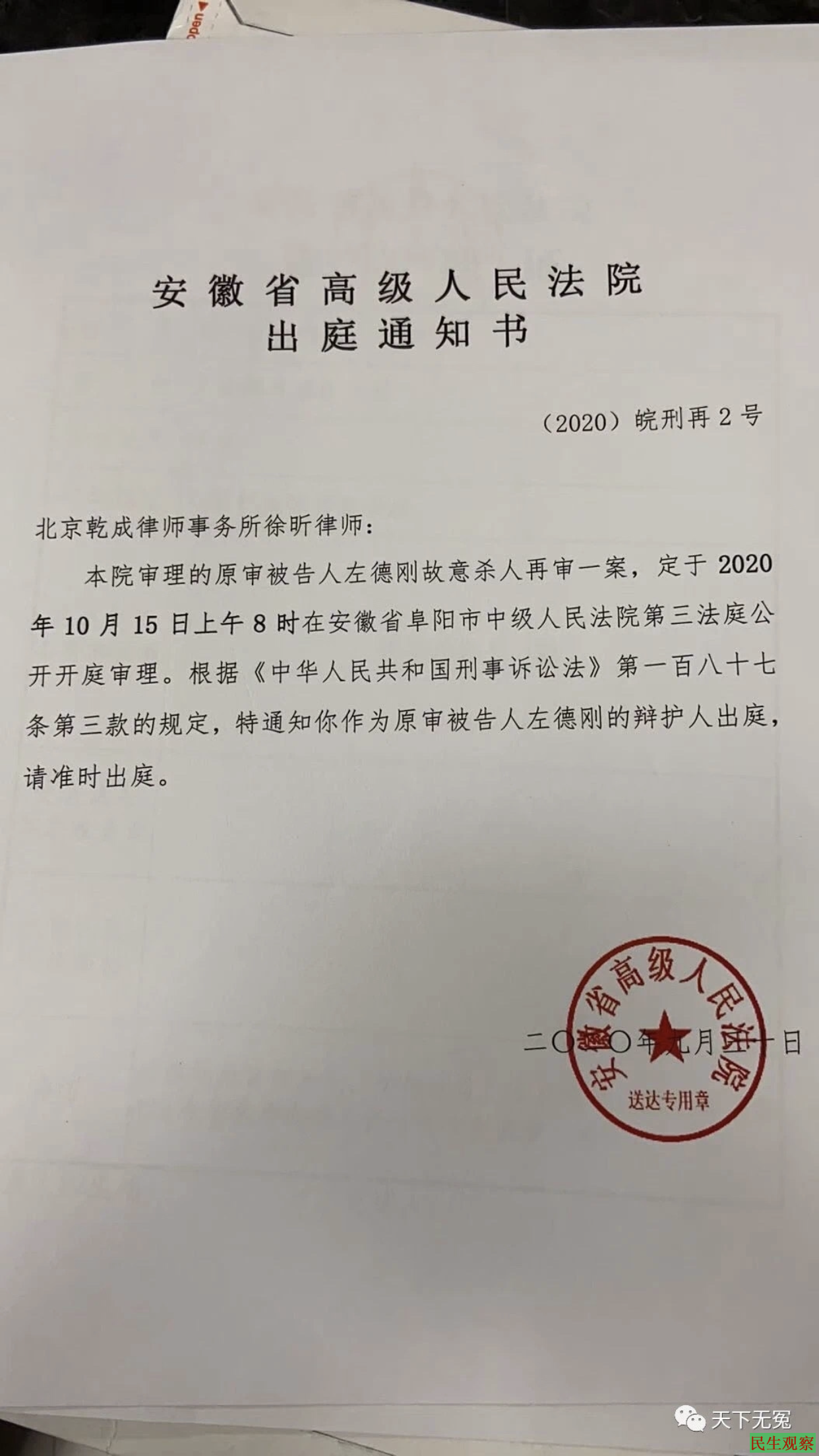 【民生观察2020年10月10日消息】本网获悉,左德刚故意杀人再审一案,将于2020年10月15日上午8时在安徽省阜阳市中级人民法院第三法庭公开开庭审理。徐昕律师将出庭为其辩护。对此,律师杨超平认为,左德刚案如继续由安徽高院管辖,已然失去了其正当性。